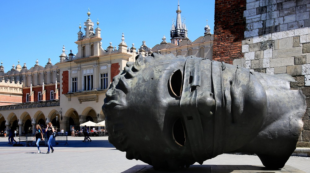 في الركن الغربي من ساحة السوق الرئيسية، منحوتة مثيرة للفضول، يطلق عليها الناس اسم "الرأس"، وهي بالفعل عبارة عن رأس برونزي مجوّف ضخم، موضوع على جانبه ومربوط بشريطين من البرونز. لا بدّ أن تستوقفك هذه المنحوتة وتبهرك بتفاصيلها الإبداعية، إنّها بالتأكيد لمسة حديثة غير عادية في الساحة القديمة بمبانيها الرائعة من العصور الوسطى. الاسم الرسميّ لهذه المنحوتة "إيروس بينداتو"، وهي من عمل الفنّان البولندي إيغور ميتوراي.